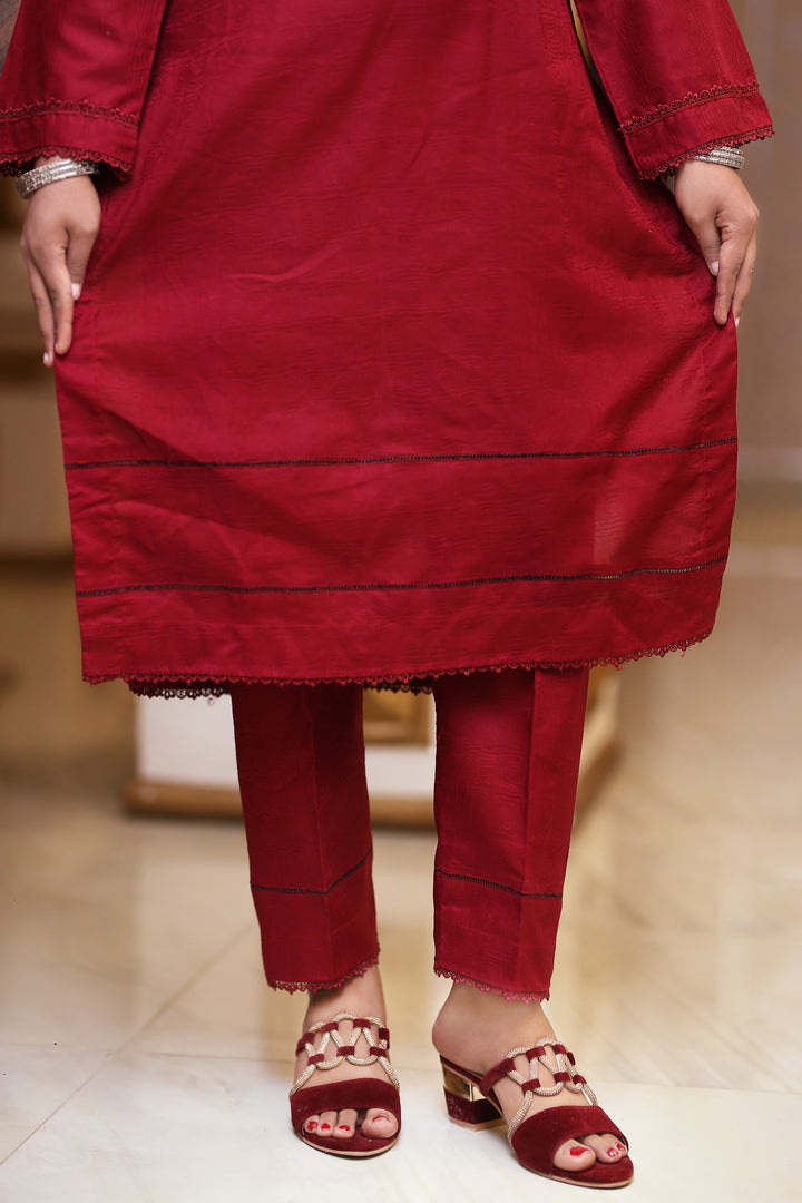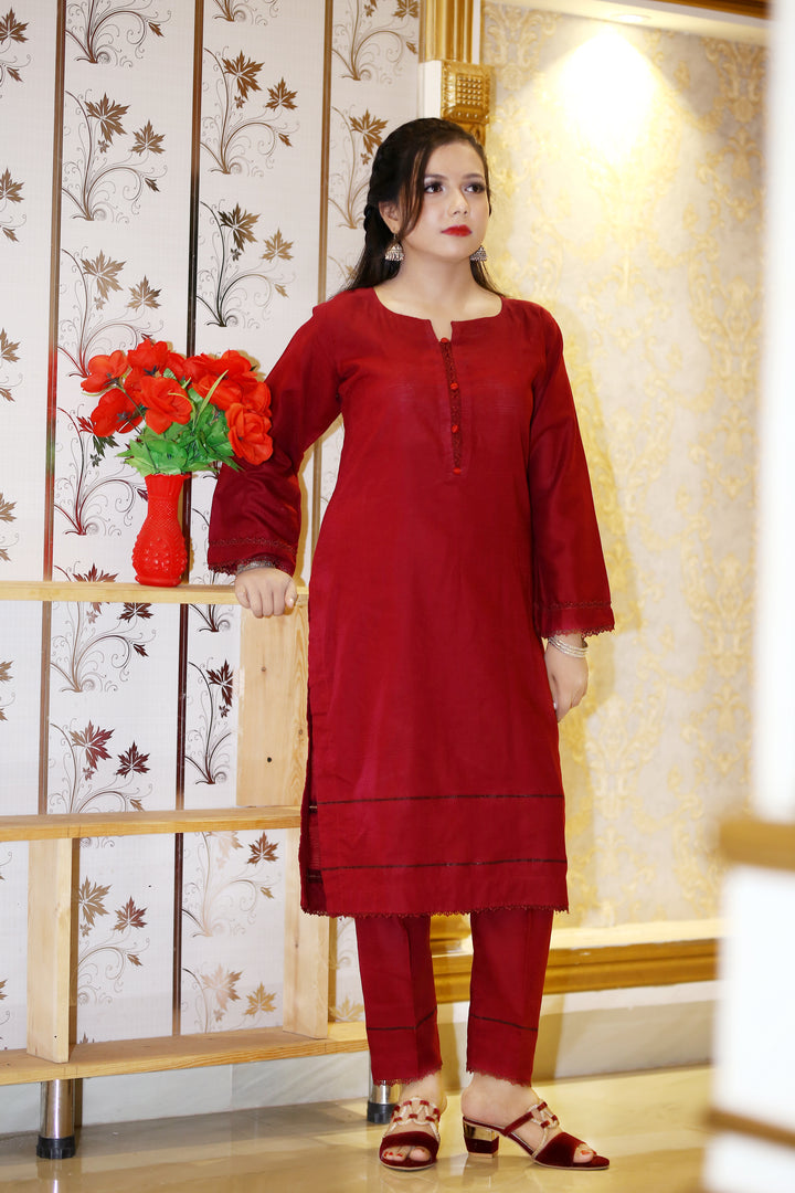 Hayati mehron red simple plan long shirt with neck Daman bazo design 2 peace.